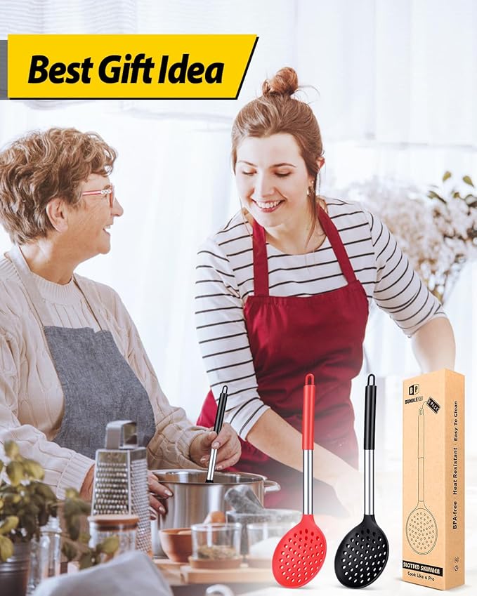 Kitchen Ladle Strainer Set of 2 Large Slotted Spoon with High Heat Resistant BPA Free Non Stick Cooking Skimmers For Draining and Frying (Black and Red)