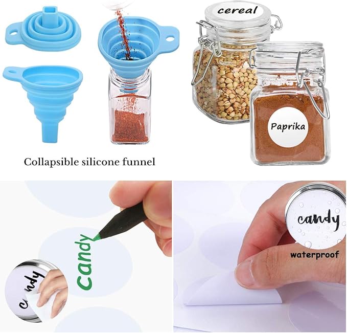 Spice Jars, 24 Pack 4oz Small Glass Jars with Airtight Hinged Lid, With 24 Spice Labels & Silicone Funnels, Airtight Glass Jars for Spices, Condiments Herb Seasoning Art Craft Storage