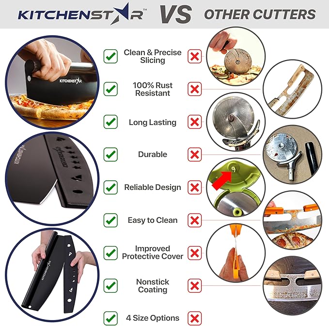 - Sharp Rocking Blade: Ensures clean, effortless cuts through any pizza crust, keeping toppings intact. Make slicing quick and enjoyable with this rocker knife