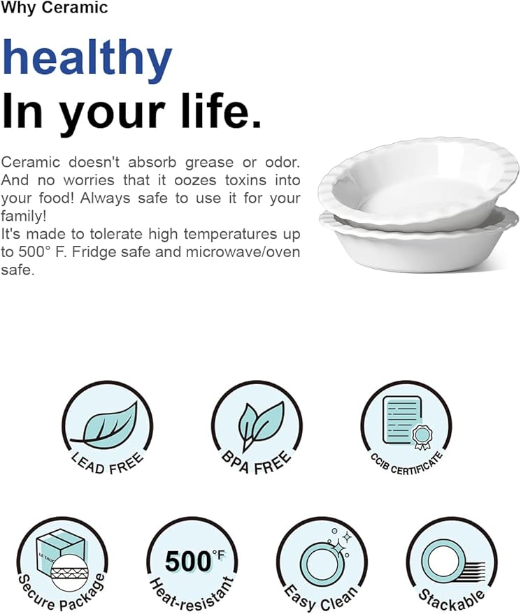 - Healthier Than Glass Pie Pan: The ceramic pie plate is made of using all-natural clay, water and gas; Each piece of pie tray is elegant and created with the finest detail; Compared to a glass or metal pie pan, the ceramic pie dish is free of heavy metals and doesn’t absorb food odors or flavors