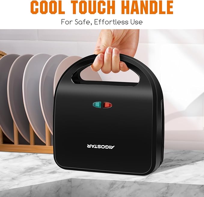 - Indicator Lights and Cool Touch Handle: Built-in a red power light and a green preheat light, the sandwich maker lets you know when it’s time to cook sandwich panini, waffle, or anything. The cool-touch handle ensures safe use and convenient portability
