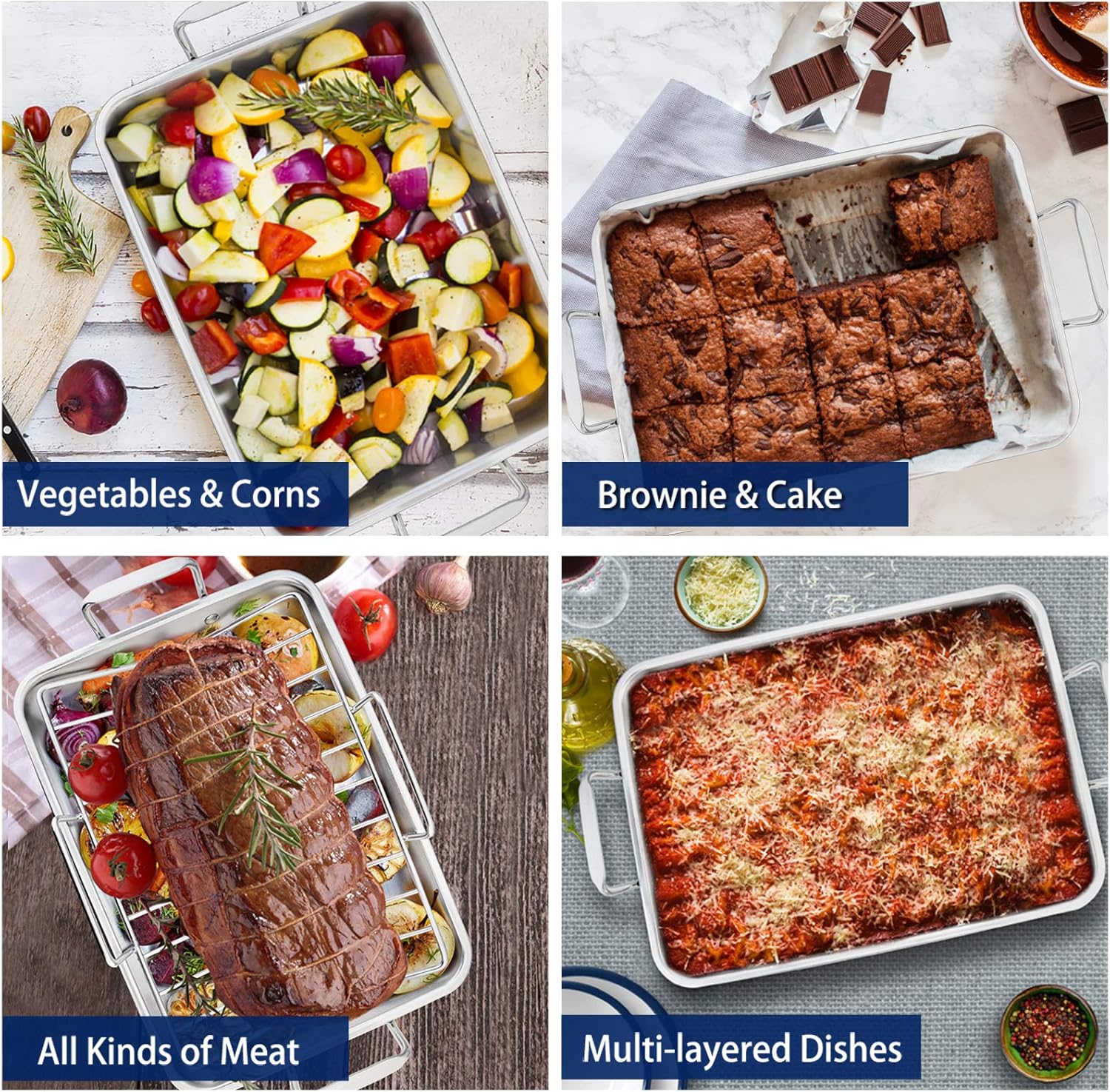 - 【ROASTER PAN WITH HANDLE】Brushed surface finish for abrasion resistance, Rounded edge without rough spots, Two handles riveted firmly without falling for secure grip, Wider space allow oven mitts to hold pan easily and take it out of the oven safely, 3.75-inch deep rim and 15.3-inch by 10.8-inch baking area can make multi-layered dishes and prevent sauce spills