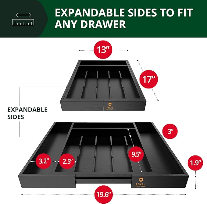 - EXTENDABLE KITCHEN DRAWER ORGANIZER; Royal Craft Wood silverware organizer can be placed in the drawers of all sizes - it is adjustable so that fits like a glove