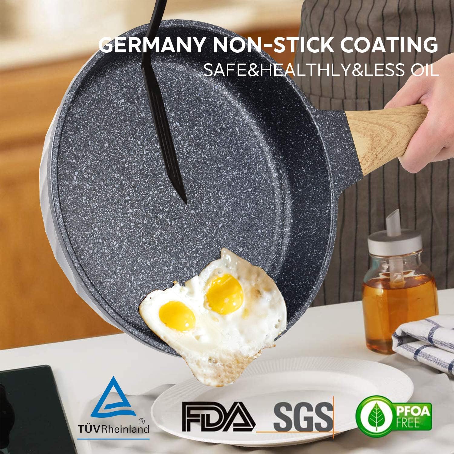 - Safety Healthy Cooking: The nonstick pan is coated with a medical stone that owns certifications from FDA, BSCI & LFGB. The natural mineral nonstick coating is very durable and at the same time 100% free of PFOA, PTFA, lead and cadmium, it is designed for healthy cooking.
