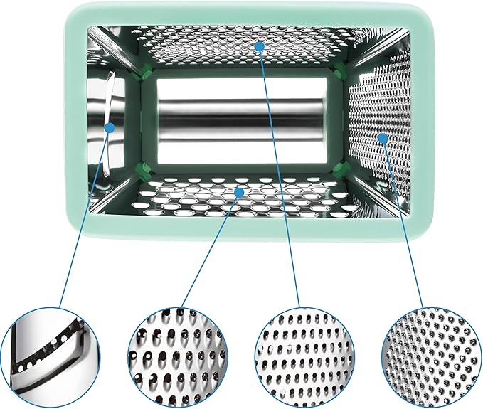 - Incredible Versatility With The 4 Sided Design: Consider getting rid of all the other graters and slicers you may own to make room for this. Coarse grating, Medium grating, Fine grating/Zester and even a Slicer - all in one convenient tool. Quickly prep an array of foods like cheese, potato, squash, zucchini, carrots, lemons and cucumbers. Multi-functional with a comfortable handle that gives you total control.