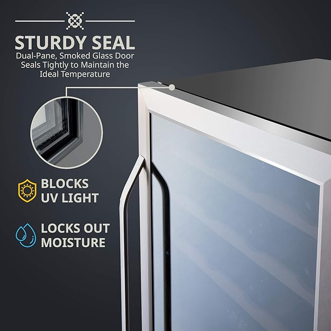 - UV-RESISTANT DOUBLE-PANED THERMOPANE GLASS - A double-paned glass door not only keeps the interior insulated, but also protects your collection from harmful UV light that can damage the tannins and overall flavor of your wine.