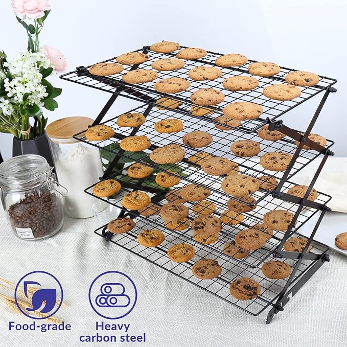 - 【High-Material】 Made using heavy-gauge materials that spread heat evenly. 4 tier cooling racks for baking works well for everything, from small items like cupcakes and muffins to large pies and cakes of significant weight. This cooling rack makes it easy to cool tons of foods while still giving you plenty of room to prepare other dishes.