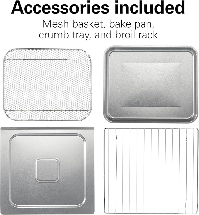 - INCLUDES ACCESSORIES: The air fryer toaster oven has 2 rack positions and includes a metal mesh basket for even air frying, bake pan, and broil rack. The basket fits on the upper oven rack with the bake pan/broil rack below to catch drippings.