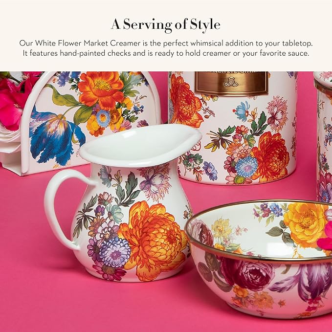MACKENZIE-CHILDS Enamel Creamer, Creamer Dispenser with Pour Spout, Kitchen Enamelware, 14-Ounce Capacity, White Flower Market