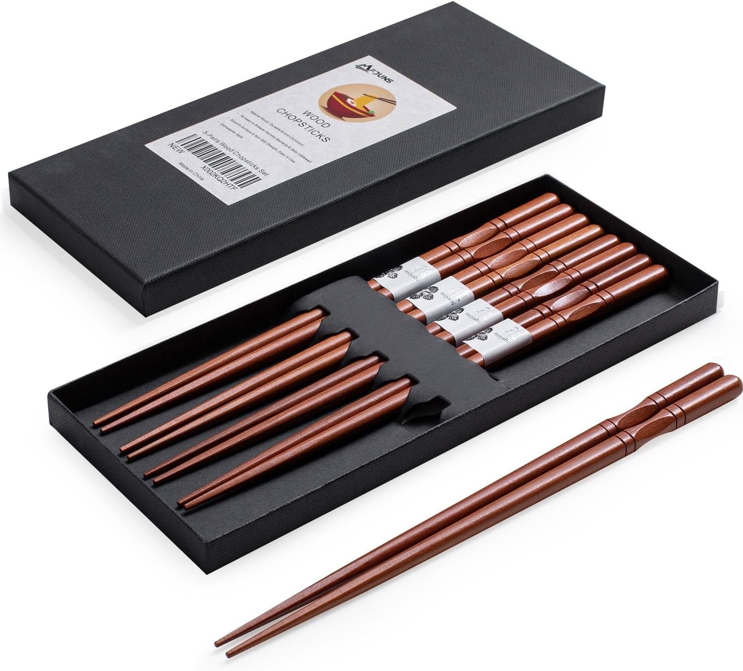 5-Pairs Japanese Chopsticks, Reusable, Non-slip Design, Natural Wood, Brown, 8.8 Inch/22.5cm, Easy to Use, Suitable for Beginners, Gift Set
