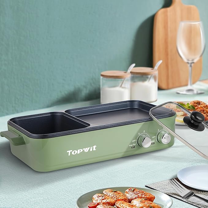 Topwit Hot Pot Electric with Grill, 2 in 1 Indoor Non-Stick Electric Pot and Griddle for Korean BBQ, Steaks, Shabu Shabu and Noodles, Independent Dual Temperature Control, Fast Heating, Green