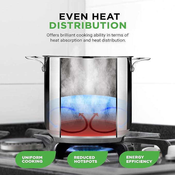 - FOOD-GRADE STAINLESS STEEL: Made of 18/8 non-reactive stainless steel interior which is non-toxic, non-allergic & safe for cooking. It has an impact bonded base for even heat distribution w/ base thickness of 0.208โ & pot dimension of 15.6โx11โx12.2โ
