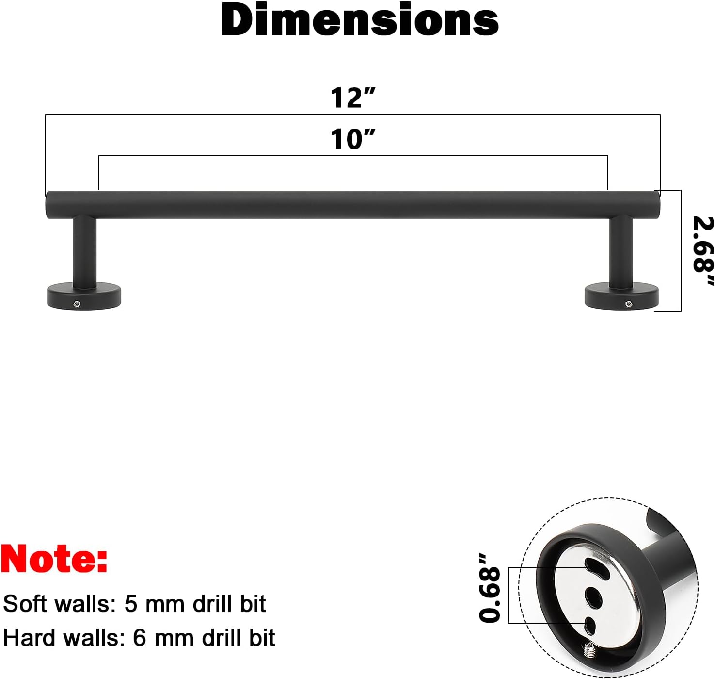 - DIMENSIONS & USE: Overall length is 12" (304mm). The length of hanging space is10" (250mm). 22-Lbs (10kgs) max weight capacity. You can mount this towel bar to either side of your cabinet or closet door for storing at-use hand and dish towels. It can also be used with S hooks, hanging bath balls, hair dryers, tea cups, spoons, clips, etc.