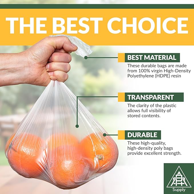 - Superb Plastic Produce Bags. Durable clear food bags are made of 100% virgin high-density polyethylene that meets all food contact requirements. High-quality, high-density poly bags on roll provide superior strength and are packaged in rolls for easy dispensing and perforated for easy tear-off.