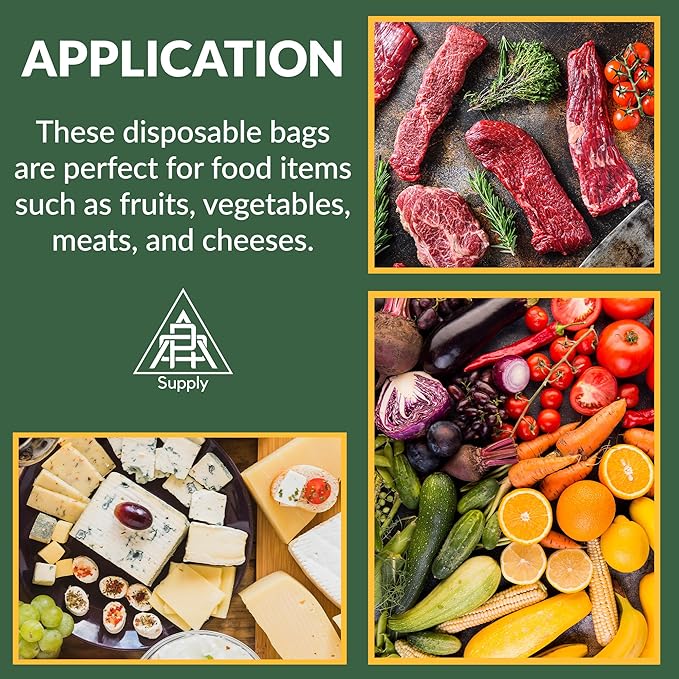 - Application. Disposable plastic bags are great for hanging produce and are suitable for fruits, vegetables, meats, and cheeses; can also use plastic bags for lightweight items in gift shops or antique stores. Great for food and for use as grocery store produce bags and farmers' market bags.