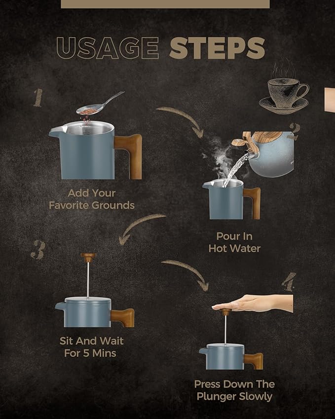 - LOOKING FOR COFFEE PRESS FOR MATCHING UP YOUR KITCHEN? We, the POLIVIAR french press coffee maker will be your smart choice. While the coffee pot is made from food grade stainless steel with stylish long-lasting coating, It is easily to match up your kitchenwares and your kitchen's theme. Also, the ergonomic handle with real wood will maximize the fantastic time of grounds you loved.
