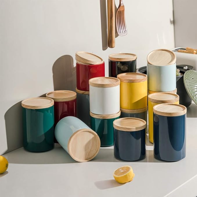 Sweejar Kitchen Canisters Ceramic Food Storage Jar, Stackable Containers with Airtight Seal Wooden Lid for Serving Ground Coffee, Tea, Sugar, Salt and More - 28 Fl Oz (Jade)