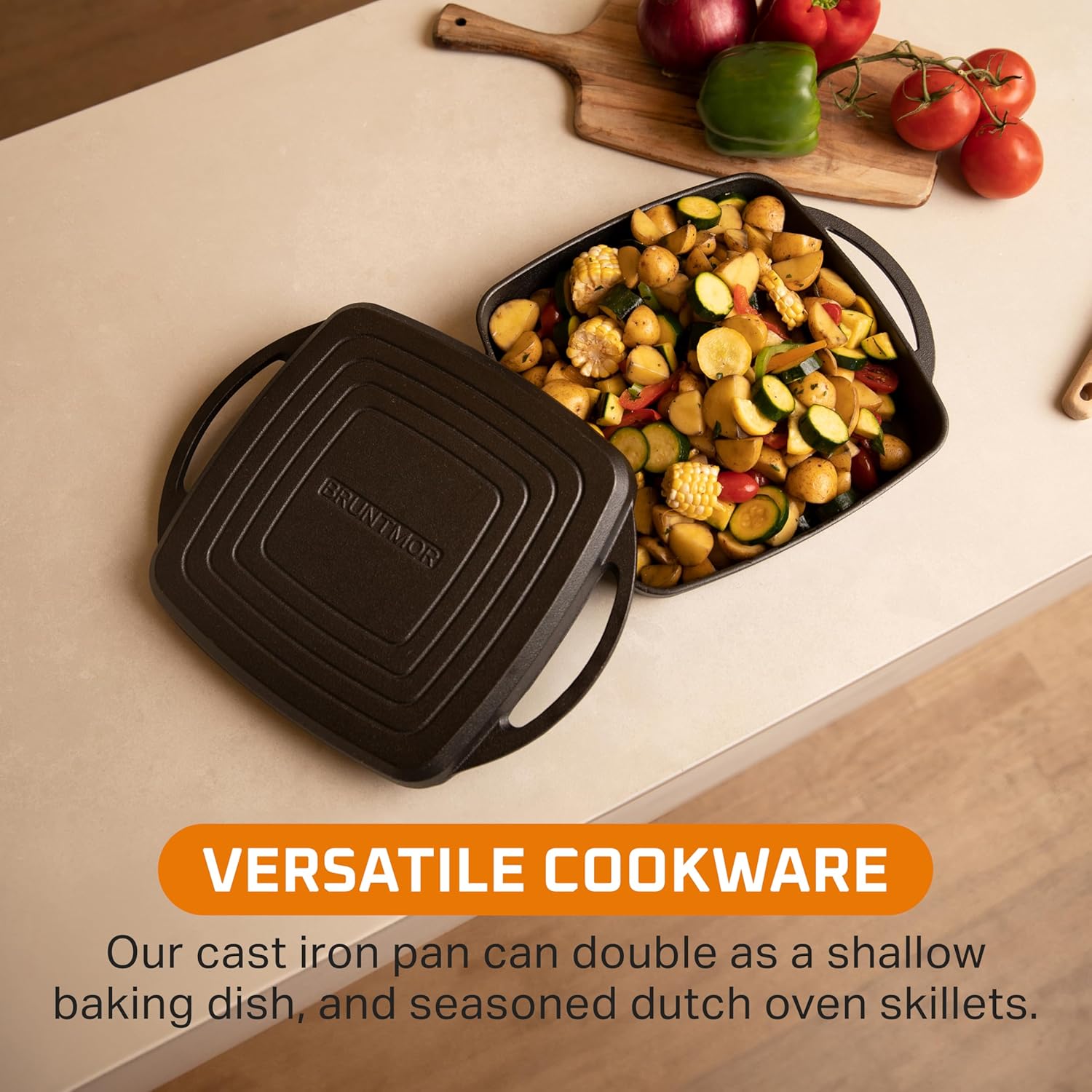 Bruntmor 2-in-1 Pre-Seasoned Cast Iron Dutch Oven and Grill Pan with Dual Handles - 11-Inch Non Stick Square Casserole Dish with Lid - Cast Iron Cookware for Braising, Crock Pot and Oven Safe Skillet