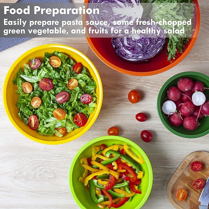 - Make Your Cooking Much Easier β A colorful plastic mixing bowls set that are a basic necessity in every kitchen,6 different sizes of 5.28, 3.59,2.22,1.27,0.69, 0.29Qt will complement your cooking and make cooking much easier. Ideal for making a quick salad, preparing food, mixing batters, or storing and serving food.