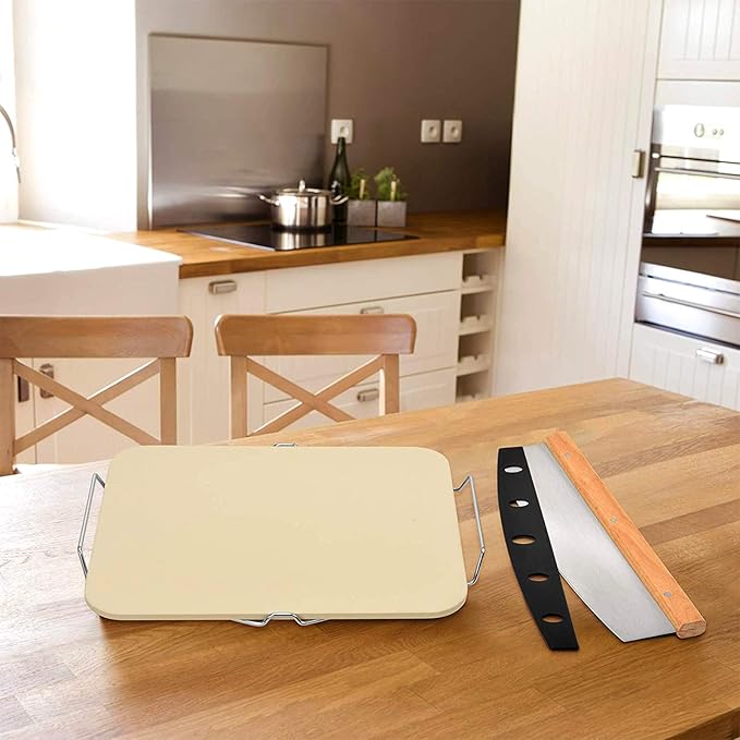 Pizza Grilling Tool Kit - Including 15 x 12 inch Pizza Stone with Metal Handle Rack, Rocker Pizza Cutter Blade with Wooden Safer Grip & Protective Cover – Premium Pizza Oven Grill Accessories