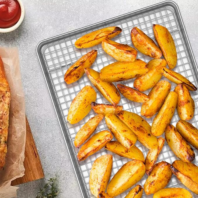 - EASY CLEAN: Deep full sides all around prevent food juice from flowing everywhere to keep your oven neat; Both the cookie sheet and baking rack are easy clean up, dishwasher safe to save your labor