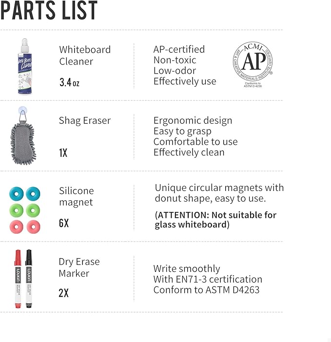 - CONTAINS: 1 x marker holder (8.4 x 3.5 x 2.7 in) ; 1 x shag eraser; 2 x dry erase markers with En713 certification; 1 x 3.4 fl oz cleaner with AP certification; 6 x strong magnet; 2 x long-lasting adhesive.