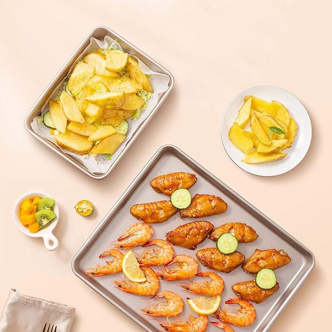 - 🍕Various Cuisine to Choose- This nonstick 11x9 baking pan set has good performance in commercial and family oven baking. It is a perfect size for baking cookies, pastry, lasagna, jelly rolls, pumpkin, chicken and vegetables, etc. Just one can easily satisfy your daily baking needs.