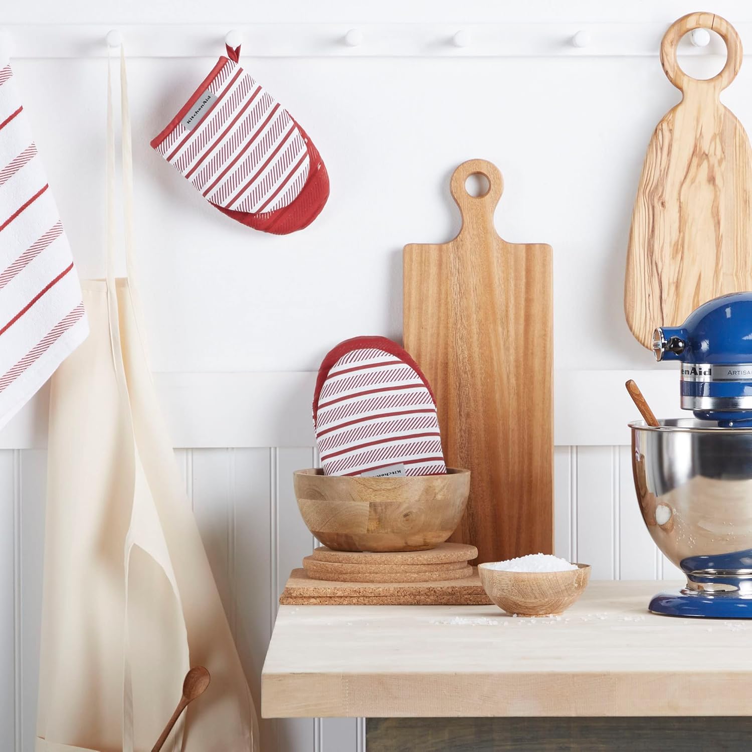 - SET OF TWO โ Shield your hands while handling hot cookware. This set includes two (2) Kitchen Aid Albany Mini Mitts, each measuring 5.5" W x 8" L.