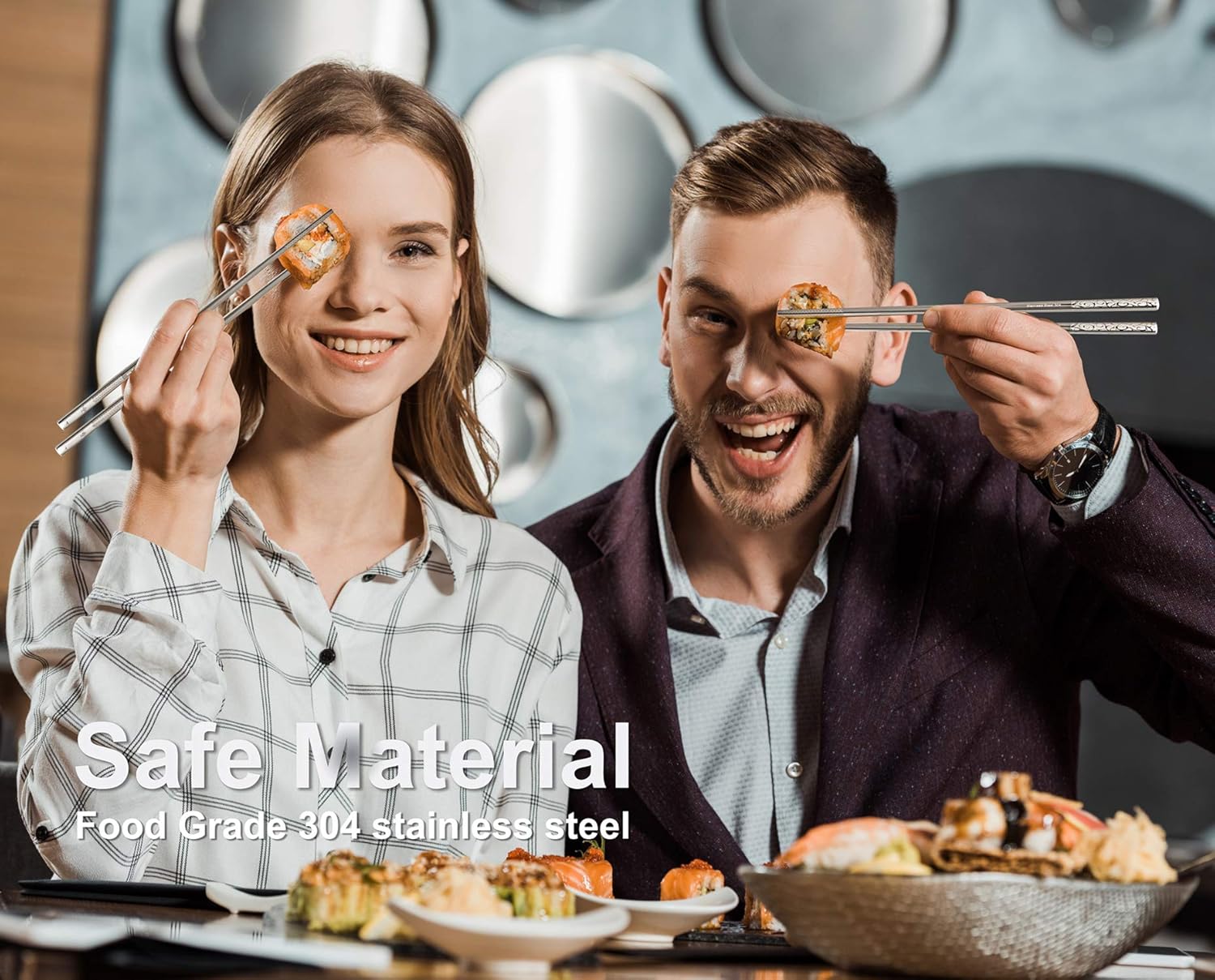 - ✿ 【Safe Material】: Our metal chopsticks are made of food-grade 304 (18/8)stainless steel. The 304 stainless steel is healthy material widely used on flatware. Those metal chopsticks made of 304 stainless steel won't get rusty like the low quality steel chopsticks. Our stainless chopsticks weigh 33g per pair, comparing with those metal chopsticks weigh 20g or less, our metal chopsticks use more material, which ensures the sturdy quality. The best choice for safe and durable reusable chopsticks.