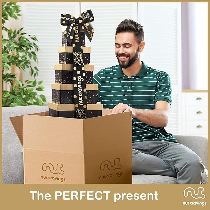NUT CRAVINGS Gourmet Collection - Get Well Soon, Nuts & Dried Fruits Tower Gift Basket with Get Well Soon Ribbon (12 Assortments) Food Arrangement, Healthy Snack Care Package, Food Assortments