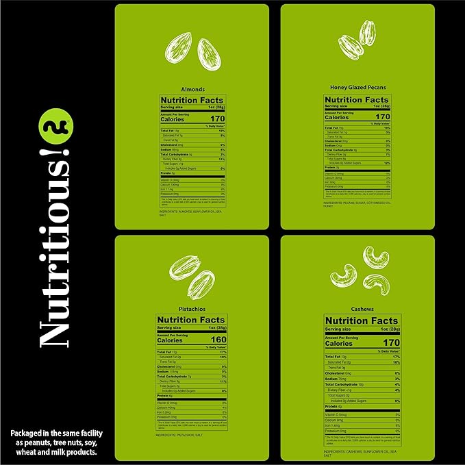 - A SELECTION OF 4 OF OUR BEST NUTS: Our Brown and Gold Gift Box includes a handful of each of our 4 signature delicious nuts: Almonds, Honey Glazed Peanuts, Cashews, and Pistachios. All naturally grown and handpicked by our farmers around the world. Weight: 12-16 Oz.