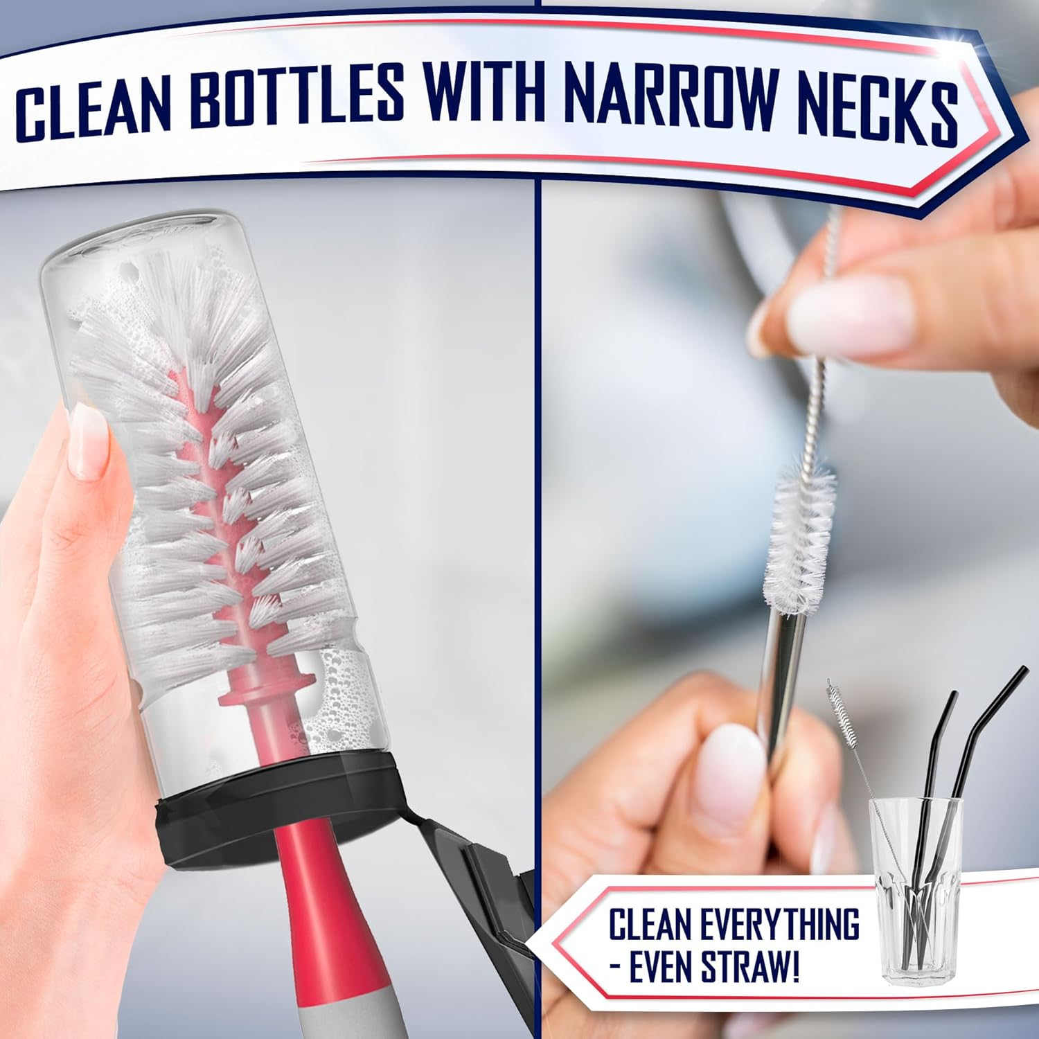 - Bottle brush - long neck to easily reach inside the bottle. Moderately stiff bristles for gentle yet effective cleaning