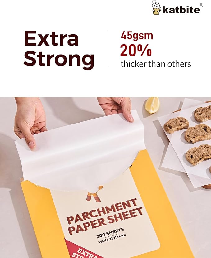- ADVANTAGES OF THE PRODUCT - Katbite baking parchment paper with 2-side food grade silicone coating, heavy duty 45gsm parchment paper, 12% thicker than others'. Greaseproof, waterproof, satisfy almost all your baking needs.