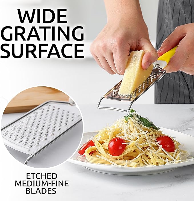 - Fast & Effortless Grating: Top-grade razor-sharp stainless steel blades make all of your shredding and grating tasks easy work. No more struggling to grate hard cheeses or vegetables. Very useful for a fine shred over salad making, sprinkled onto pizza dough, citrus zester, garlic grater or just a nice accompaniment to a warm bowl of soup or pasta.