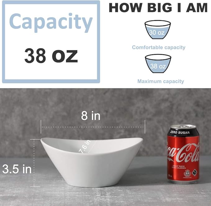Porcelain Salad Bowls, 38 Ounce pasta bowls set of 4, 8 inch White serving bowls for cereal, soup, ramen, snacks, rice, Oven Dishwasher Safe