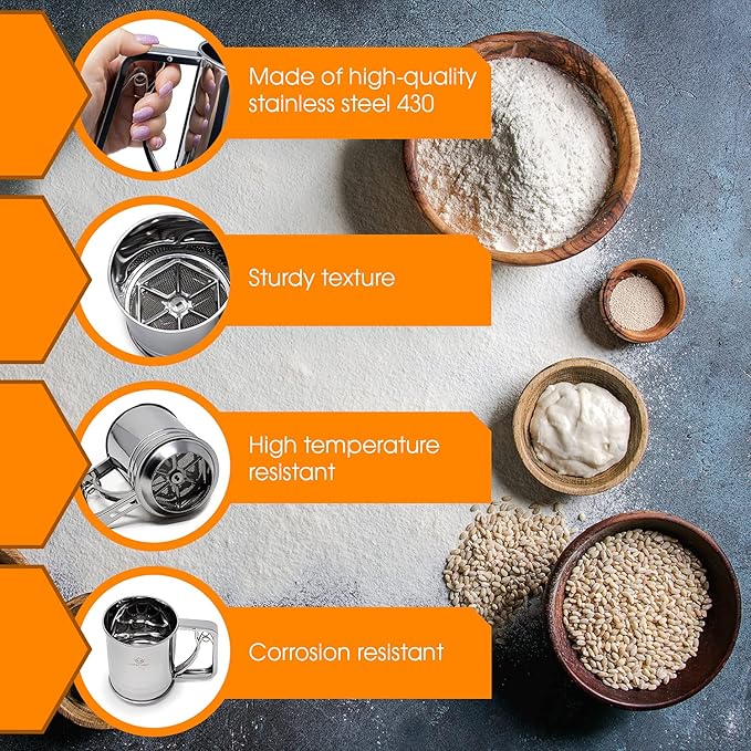 - Food Grade Stainless Steel: Our 3 cup sifter is made with rust and corrosion-resistant food-grade stainless steel to give it more durability and resilience and ensure long-lasting use in the kitchen