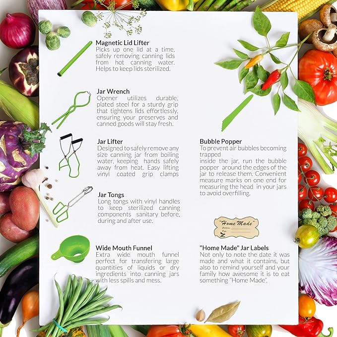 - The perfect gift - This dishwasher safe canning starter kit for all your jarring needs. From jam, jelly, pickle, sauce, to salsa and stew. The perfect gift for anyone interested in water bath canning, dehydrating supplies, jam maker tool kit, pickling jars & pickling equipment , sauce making & sauce bottles for canning, canning lids wide mouth ,canning lids regular , canning rack , canning pressure cookers , canning tongs ,canning equipment & canning utensils & home essentials.