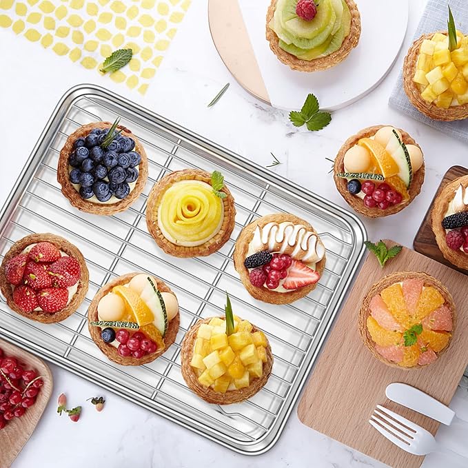 - π [ADVANCED CRAFT] Baking trays with smooth rolled edge and round corner without rough spot for comfortably hold and transfer. 1-inch deep rim avoid food juice flowing everywhere, keep your oven neat. Shiny and attractive mirror finished surface provides effortless release of baked goods. Both the cookie sheets and wire racks are easily clean even wash by hand, dishwasher safe making both cooking and clean-up a breeze!