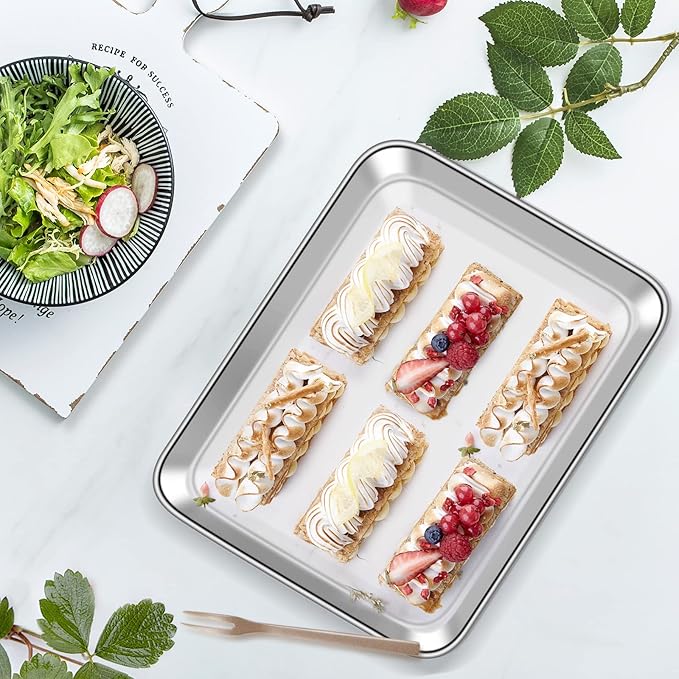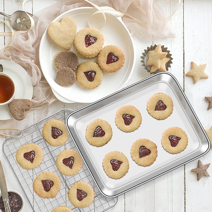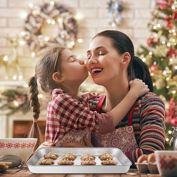 - 🎄【ADVANCED CRAFT】Baking trays with smooth rolled edge and round corner without rough spot for comfortably hold and transfer. 1-inch deep rim avoid food juice flowing everywhere, keep your oven neat. Shiny and attractive mirror finished surface provides effortless release of baked goods. Both the cookie sheets and wire racks are easily clean even wash by hand, dishwasher safe making both cooking and clean-up a breeze!