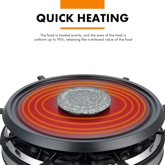 - Get All Accessories You Need Here - The raclette fondue combo includes one main grill pate, one fondue bowl, 8 pcs fondue forks, 8pcs mini grill pans, 8 pcs wooden spatulas and one grill stone. Get all you need for one price with one raclette fondue combo here!