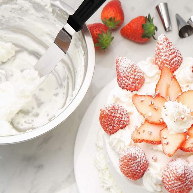 - 1. The Balance: Our offset spatula features a high-quality stainless-steel blade that strikes the perfect balance between rigidity and flexibility. It effortlessly glides across frosted cakes, making icing a breeze. Say goodbye to uneven icing!