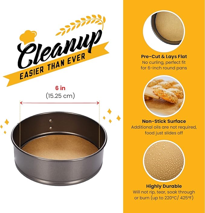 - SAVE YOURSELF THE HASSLE – Are you tired of wasting time cutting a perfectly sized liner for your round cake pans? Well, your struggles are finally over. Baker’s Signature precut, and unbleached baking sheets are just right for your 6-inch pans. Our sheets do not curl, stick or burn leaving you with just one thing to do – let your delicious recipes come to life! Perfect for baking your favorite cakes, tortes and more. Our parchment rounds will take the hassle out of your baking, guaranteed.