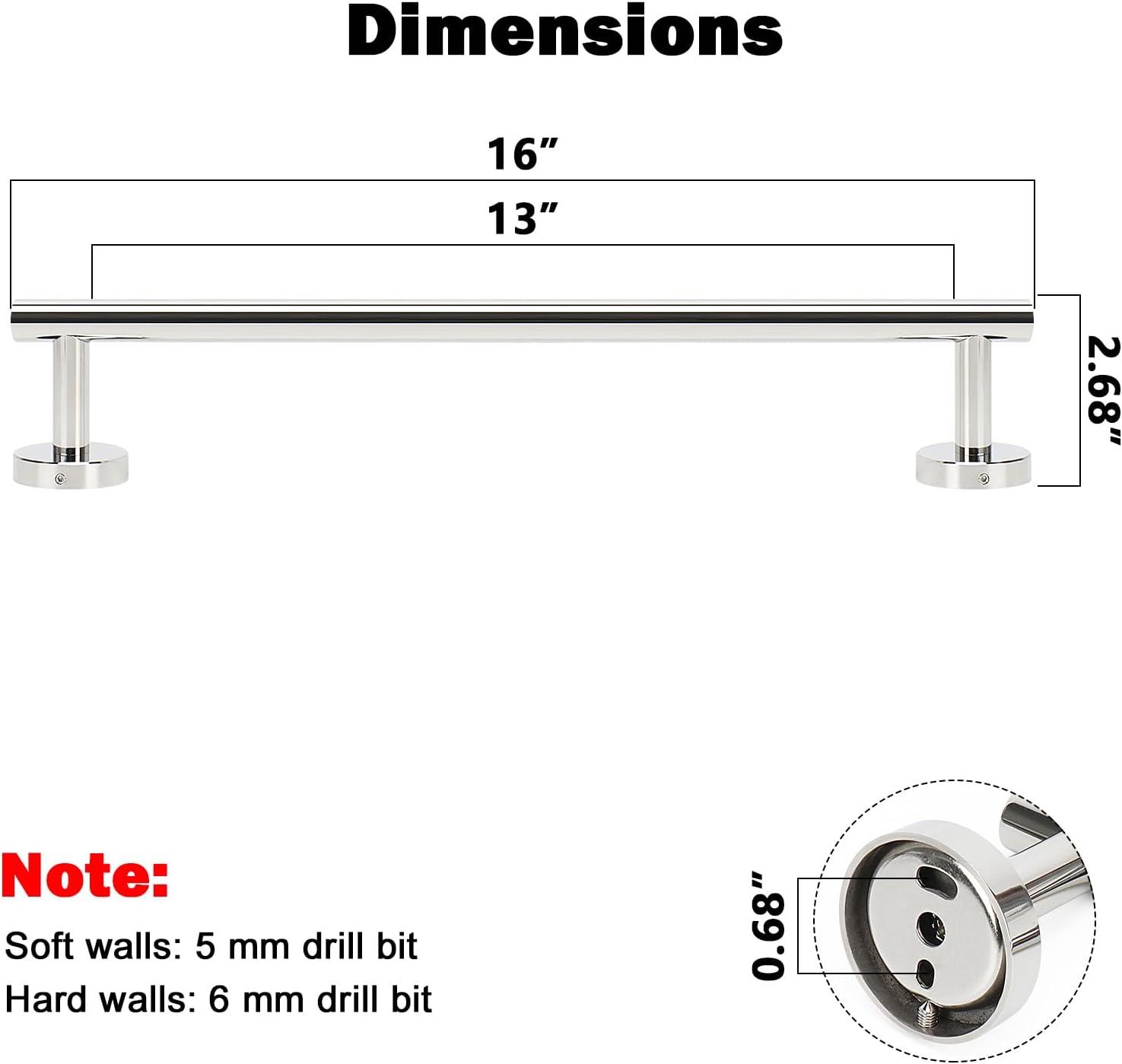 - DIMENSIONS & USE: Overall length is 16" (405mm). The length of hanging space is13" (340mm). 22-Lbs (10kgs) max weight capacity. You can mount this towel bar to either side of your cabinet or closet door for storing at-use hand and dish towels. It can also be used with S hooks, hanging bath balls, hair dryers, tea cups, spoons, clips, etc.