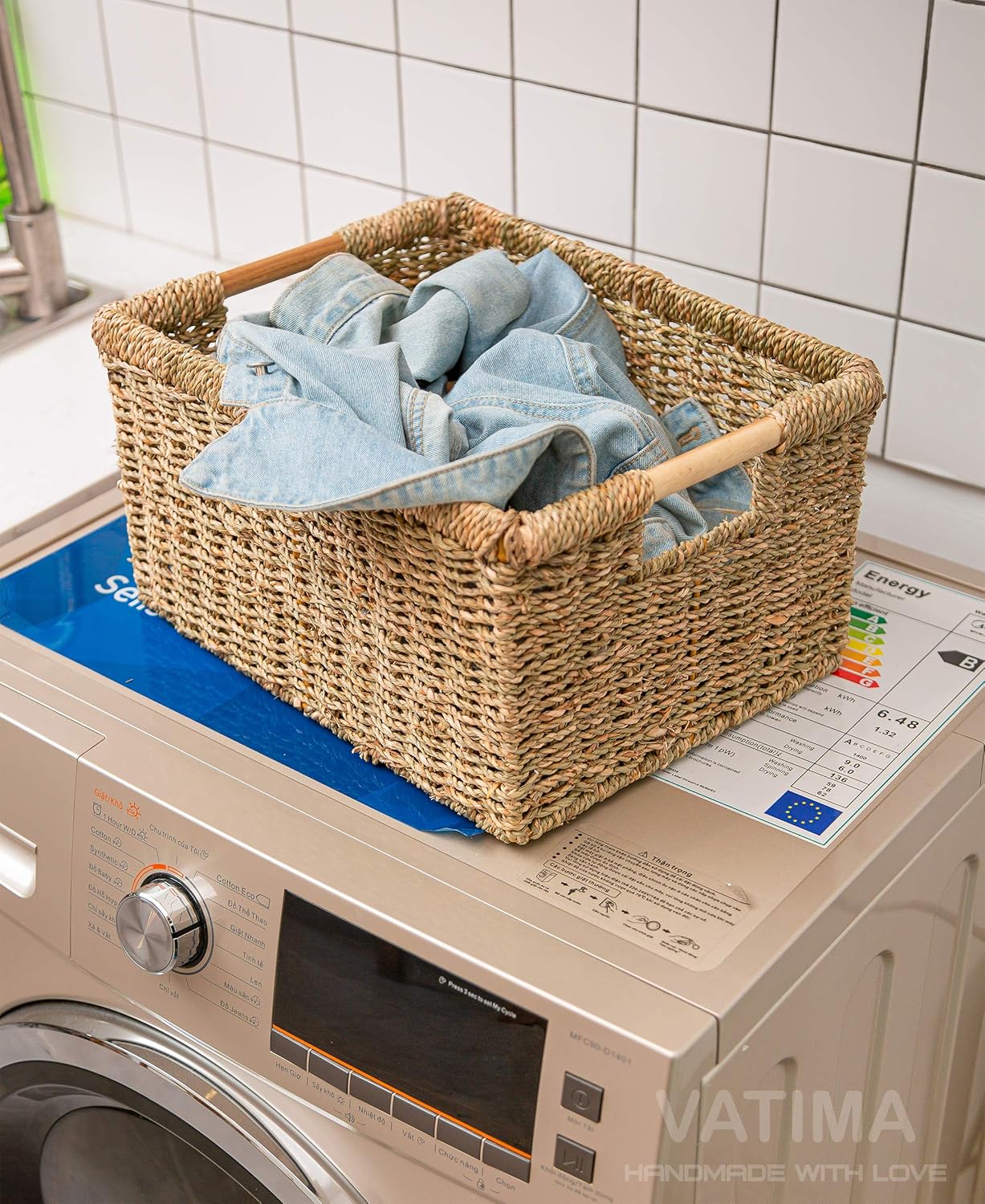 - β WICKER BASKETS - Whether it be by way of pure decor, storage, or organization for kitchen, pantry, or bathroom. This natural Seagrass basket suit your home in every way. The rectangular storage basket is great for magazines, games, pet toys, media, household items.