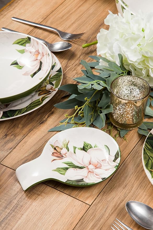 Bico Magnolia Floral Spoon Rest for Stove Top, Ceramic Spoon Holder for Kitchen Counter, Easy to Clean Coffee Spoon Rest Dishwasher Safe, Kitchen Cooking Utensil Rest for Ladles Spatula