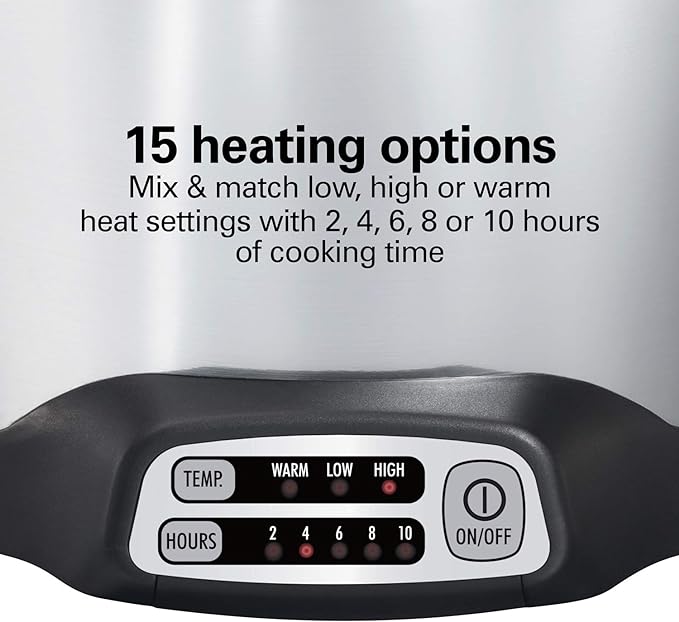 - 15 HEATING OPTIONS: This programmable slow cooker lets you mix and match high, low or warm heat settings with your choice of 2, 4, 6, 8 or 10 hours of cooking time.