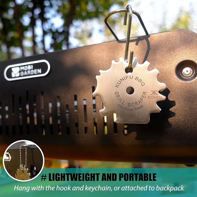 - Compact and Convenient - Come from gifts packages, includes Grate Grill Scraper, hanging hook and chain. Lightweight and portable, can be hooked with the keychain, or attached to the backpack when you go camping or hiking.