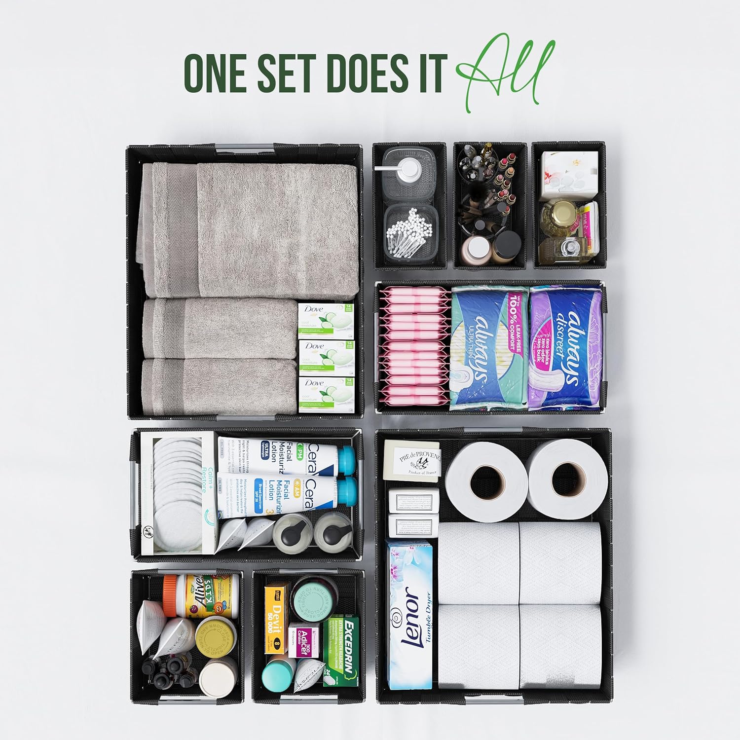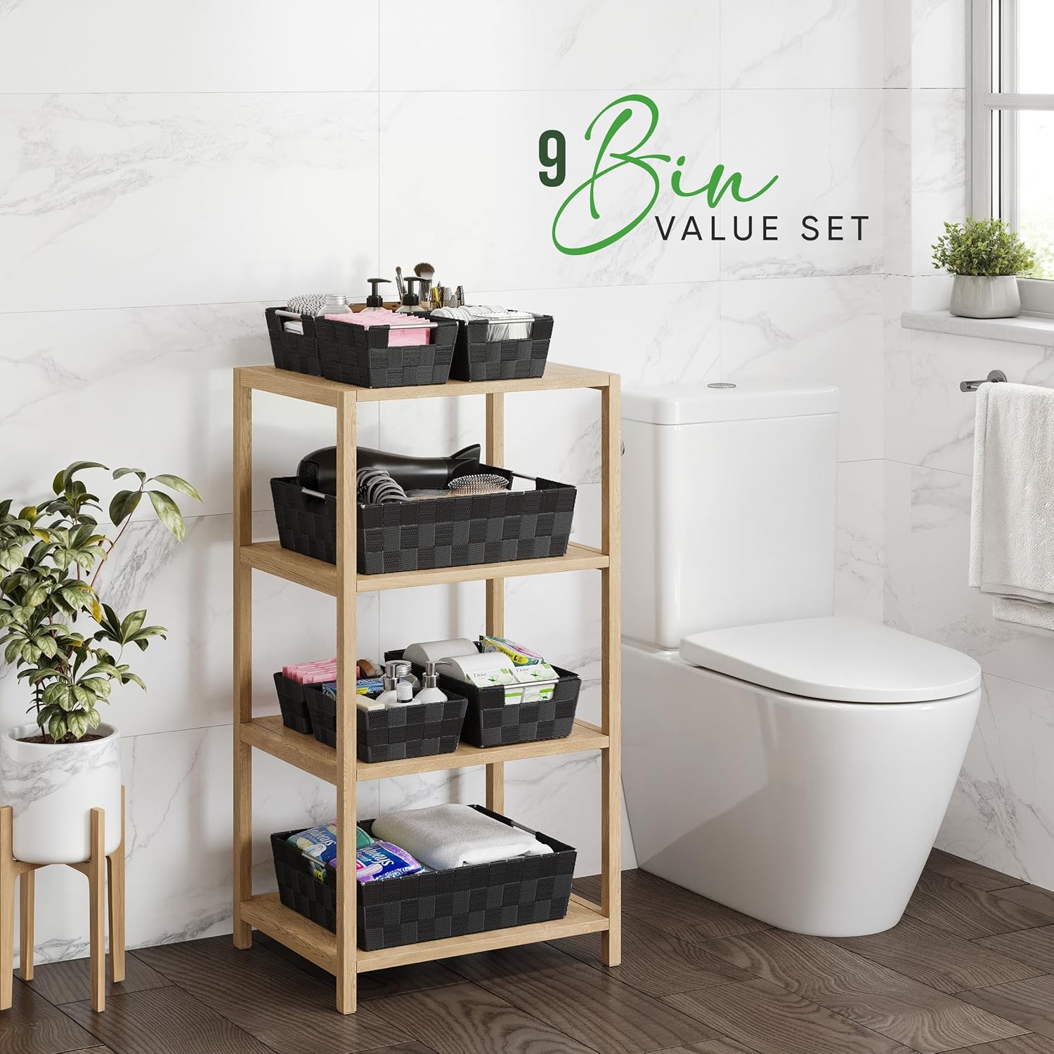 - VALUE PACK SET OF 9 STORAGE BASKETS FOR SHELVES: Get the most for your money with this versatile set of 9 baskets for organizing, designed to tackle clutter in bathrooms, pantries, offices, and more. These storage bins for shelves are perfect for keeping cosmetics, toiletries, and pantry essentials neat and tidy. Stylish and functional, these fabric storage bins and small storage bins make organizing any space effortless!