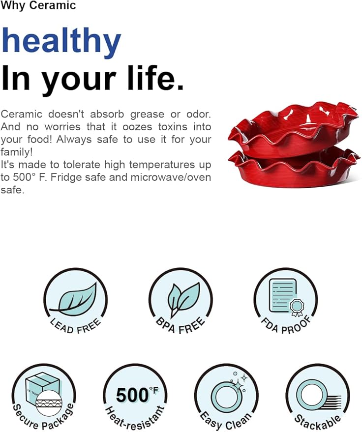 - Healthy Choice: The ceramic pie dish elevates pie baking from ordinary to art as it evenly distributes the heat during baking; Durable for everyday use; The highly resistant glaze does not absorb food odors or flavors