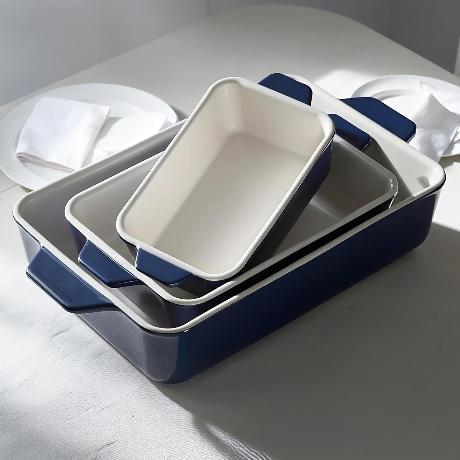 Kook Casserole Dish, Ceramic Baking Dish, Large Lasagna Pan Deep for Oven, 8.5 x 14, 11 x 7, 8 x 5, Set of 3, 92oz, 50oz, 20oz, Baking Pan with Handles, Oven Safe and Durable, Home, Gift, (Navy)
